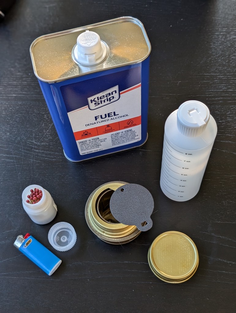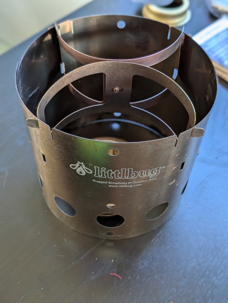 In terms of fuels, the Littlbug can be powered by an alcohol burner or a small wood fire. The fire is festive, but of course entails a bit more time and effort, so I plan to travel ready to deploy either.