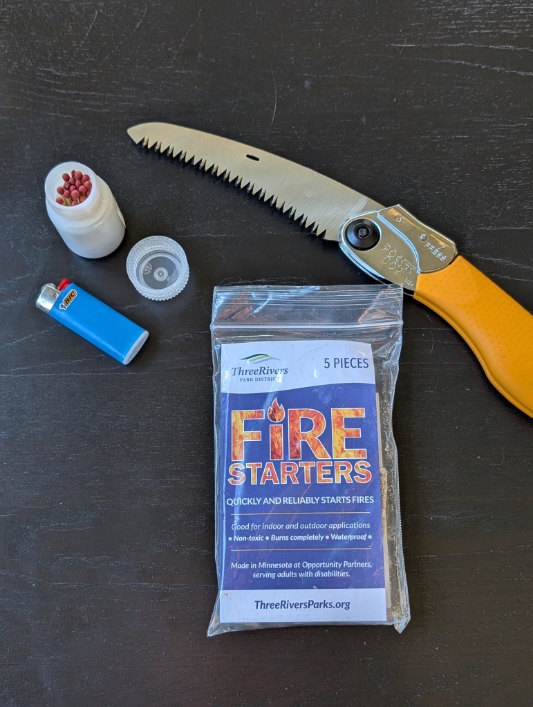 Matches in a tiny Nalgene work pretty well, but I found out the hard way to always carry a small lighter in case they won’t strike. I also have these genius fire starter sticks that are a combination of wax and sawdust and virtually guarantee a start, found through the Three Rivers Park district in Minneapolis.