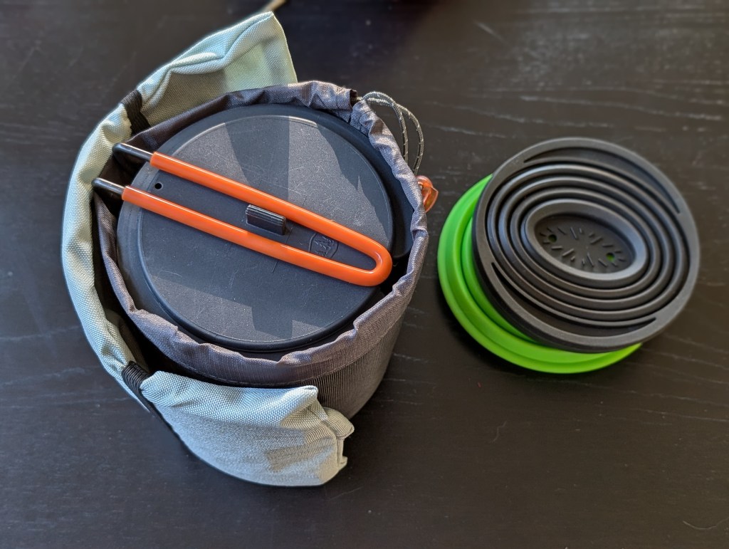I finally decided not to go the typical route with a gas-powered backpacking stove, and instead found a very clever device made out of curved sheets of stainless. It comes apart and packs down very small in a semi-circle around a pot. Inside the pot I can nest a bowl, a coffee cup, a burner, and a spork, and then top the whole thing with a second collapsible bowl and a coffee drip.